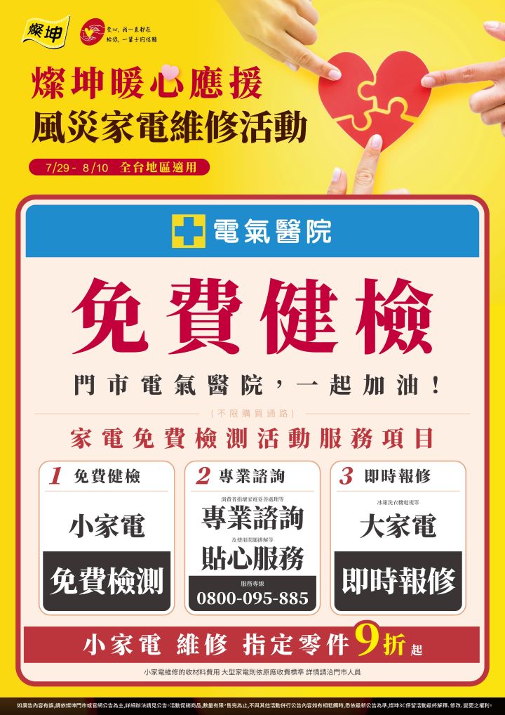 中央氣象署今(29)日表示,因受到西南氣流及「竹節草」颱風外圍環流影響,造成台灣各地天氣不穩定,易發生大豪雨或局部豪雨,也連帶影響許多地區出現淹水及電力設施受損,影響供電。燦坤3C家電本著企業社會責任精神,發起暖心3大應援方案,方案1:即日起至8月10日期間,凡家中有受潮、泡水小家電皆可拿到全台燦坤門市電氣醫院接受免費檢測,受檢商品不限消費通路或保固期限,皆可享免費健檢服務;方案2:小家電維修再享指定零件9折起優惠;方案3:冰箱、洗衣機、電視等大型家電則可通過就近燦坤門市即時報修,同時燦坤專業電氣醫生也提供民眾泡水、受潮家電妥善處理等專業諮詢或家電使用問題排解等貼心服務,服務專線0800-095-885,歡迎消費者親洽或致電鄰近燦坤門市辦理。
