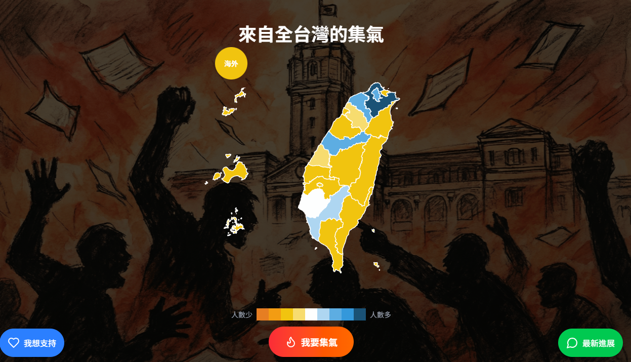 「成為我們的後盾!」連署網站指出,對抗謊言的路途艱辛且漫長,我們需要糧草才能持續戰鬥,「如果您認同這份理念,請點擊網頁上的『我想支持』,您的每一分幫助,都是擊垮高牆的關鍵力量!」從平台資料顯示,目前北北桃「集氣來到淺藍至深藍色(人數最多),其他縣市陸續集氣中,整體顏色大致落在黃色至白色(中間),橘色則為最少」。