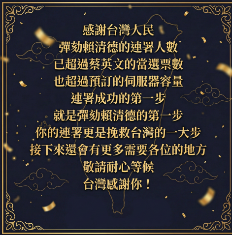 連署達標後,由「直球對決」經營的網站寫道,「由於超過預定的伺服器容量,連署成功的第一步就是彈劾賴清德的第一步,你的連署更是挽救台灣的一大步,接下來還有更多需要各位的地方」。