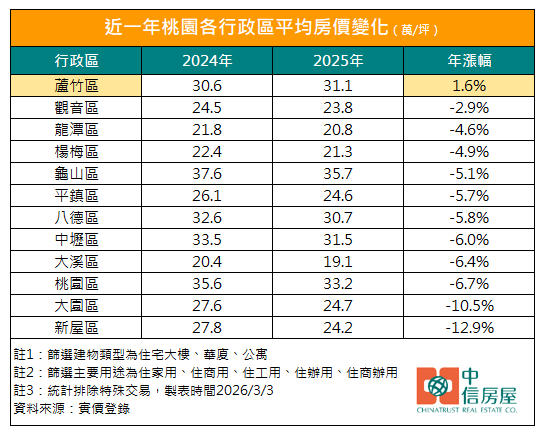 眼看大台北房價居高難下,桃園憑藉相對親民的房價,成為不少「脫北族」購屋布局的首選。中信房屋研展室彙整實價登錄資料發現,過去一年桃園多數行政區的平均房價變化均呈現負值,其中新屋區年跌幅達12.9%最為顯著,大園區亦下滑10.5%。然而,在一片跌勢中,蘆竹區卻逆勢上揚,平均單價從2024年的每坪30.6萬元微幅攀升至2025年的每坪31.1萬元,年增1.6%,成為桃園市唯一維持房價正成長的行政區。