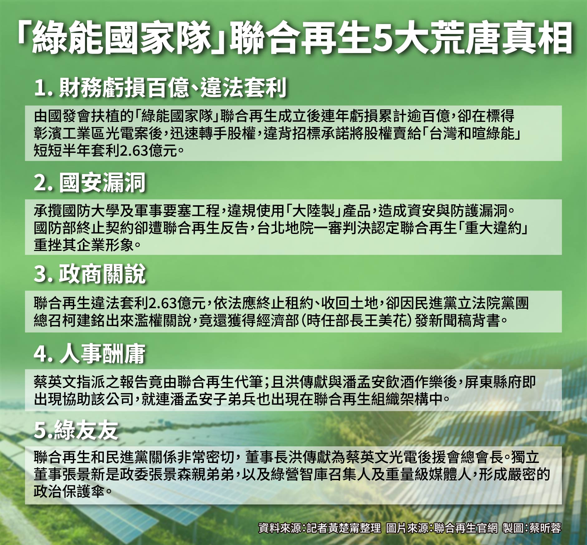 由國發會「產業創新轉型基金」斥資近30億元,扶植成立的綠能國家隊、太陽能大廠「聯合再生」近年弊案頻傳,原預估聯合再生成立後隔年即可轉虧為盈,沒想到過去幾年,虧損狀況未獲改善,還累計虧損高達上百億。而該公司承攬的國防部蘭陽指揮部及國防大學屋頂型光電工程,又被踢爆違規使用陸製產品;甚至標到經濟部彰濱工業區光電建置案,半年內就將股權轉售,用4.26億全部賣給另外一家「台灣和暄綠能」公司,違法套利2.63億元。