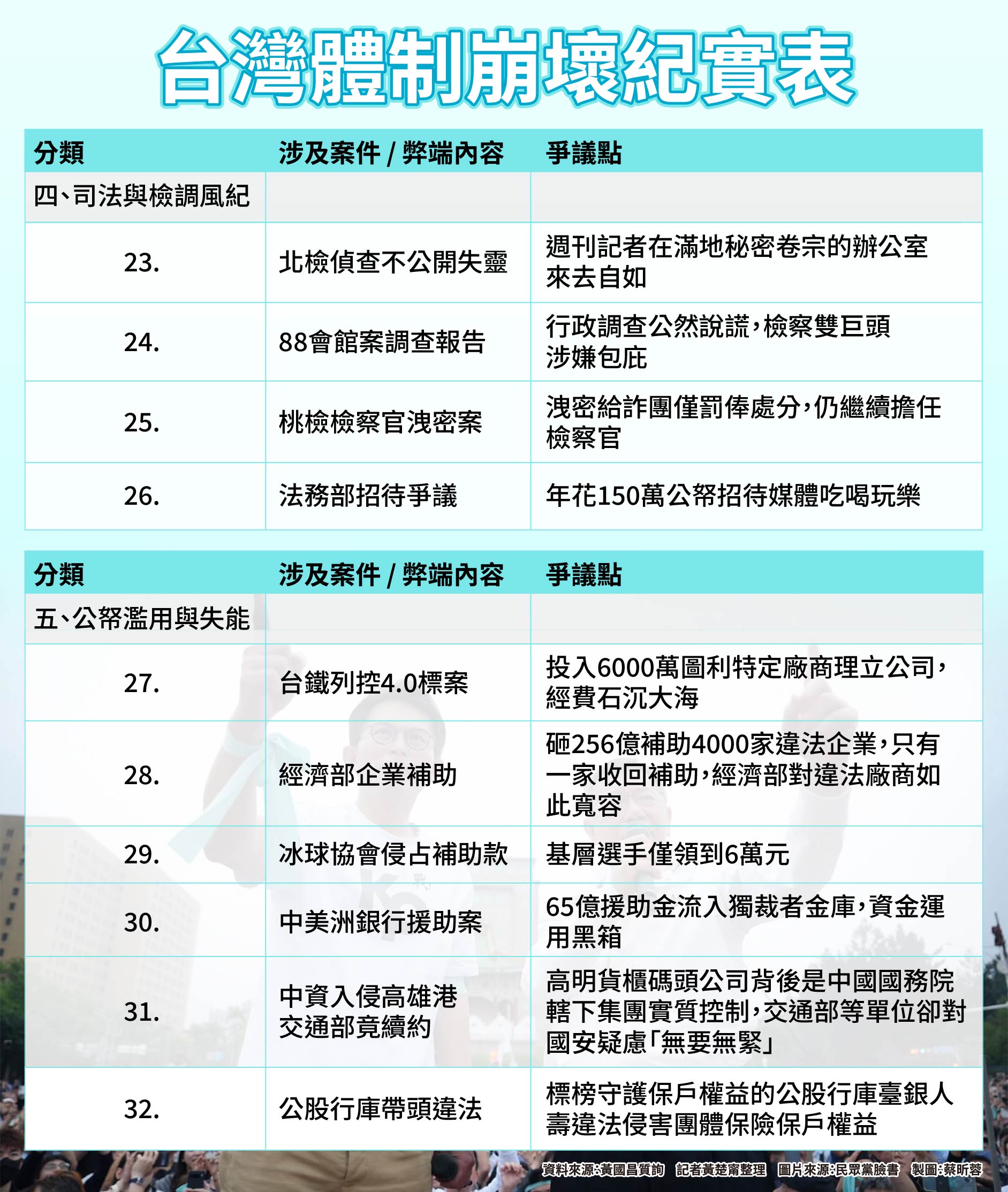 黃國昌也揭露下述這些案件,「法務部在書面報告中指稱媒體採訪檢察機關應在限制區,卻只見週刊記者在滿地秘密卷宗的北檢辦公室中來去自如」、「揪88會館案行政調查報告公然說謊,檢察雙巨頭包庇」、「鄭文燦圖利民進黨金主,暴利至少10億元」、「控前麥寮鄉長圖利英系權貴,民代不敢管」、「台鐵投入6000多萬啟動列控4.0,卻圖利特定廠商理立公司,拿幾千萬打水漂」、「檢察官洩密給詐團,結果桃園地檢署簽結,最後出來只罰俸,還讓她繼續當檢察官」、「冰球協會涉嫌侵占補助款,選手僅領到6萬元」、「披露中共勢力入侵高雄港,交通部竟續約」。