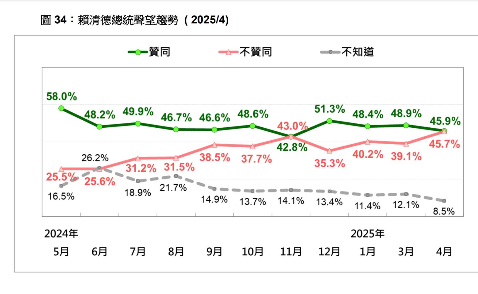 民調問:「賴清德總統上任近一年,一般說來,您贊同或不贊同他處理國家大事的方式,包括重要人事安排與政策?」結果發現國人有45.9%贊同(16.4%非常贊同,29.5%還算贊同)賴清德處理國家大事的方式,45.7%不贊同(24.2%不太贊同,21.5%一點也不贊同),8.5%沒意見、不知道。贊同者只比不贊同者多0.2個百分點,與上個月9.8個百分點有天壤之別。