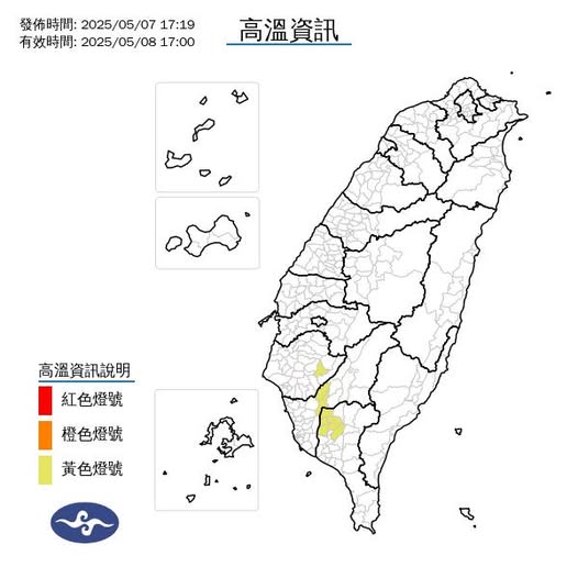 天氣高溫炎熱,氣象署發布高溫資訊,中午前後台南市、高雄市、屏東縣為「黃色燈號」,有出現攝氏36度以上高溫的機會,請注意。