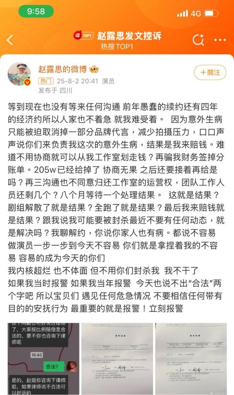 趙露思在微博發文,她因身體突發狀況被迫取消部分代言與劇組拍攝,經紀公司口頭承諾會承擔相關損失,卻在未經協商下直接自其工作室帳戶劃走205萬元人民幣作為賠償款。更令其憤怒的是,公司疑似誘導其財務簽署分帳文件,令趙方在未完全知情下「背書」轉帳行為。
