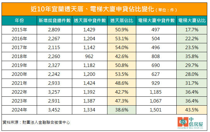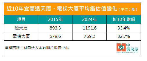 最近幾年在科學園區、交通建設題材帶動下,宜蘭房市交易量持續增溫,不僅吸引眾多建商插旗推案,熱門產品的結構也出現了明顯轉變。中信房屋研展室彙整聯徵中心資料顯示,2015年透天厝仍以50.9%交易占比穩居市場主流,電梯大廈僅佔17.7%;至2024年,電梯大廈交易占比已增加至 43.5%,首度超越透天厝的 38.6%,成為宜蘭房市新寵。從價格走勢來看,過去十年間,宜蘭透天厝平均鑑估總價由893.3萬元漲至1191.6萬元,漲幅33.4%;電梯大樓則由579.6萬元攀升至769.2萬元,漲幅32.7%,漲勢同樣驚人。