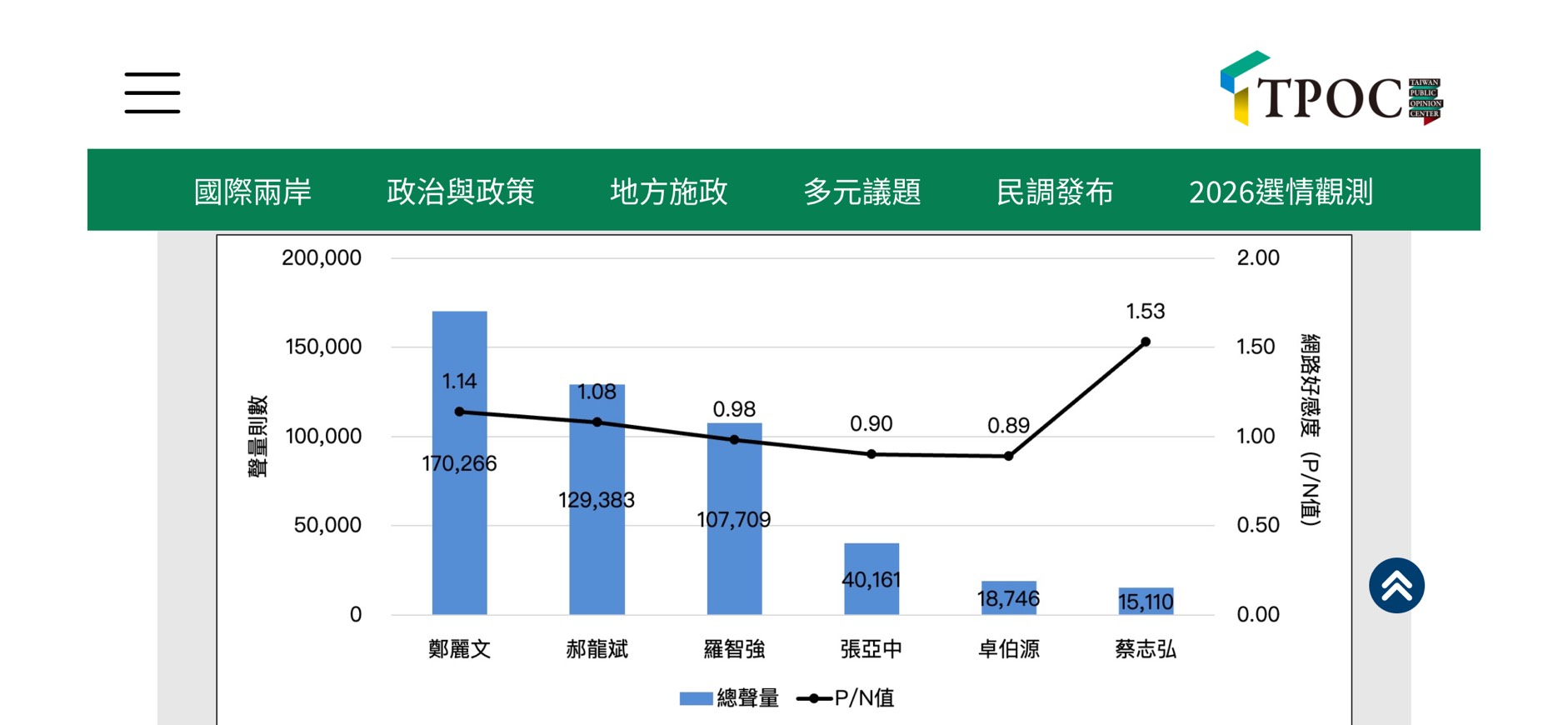 蔡志弘:120筆,鄭麗文:102筆,羅智強:98筆,張亞中:94筆,郝龍斌: 94筆,卓伯源:36筆