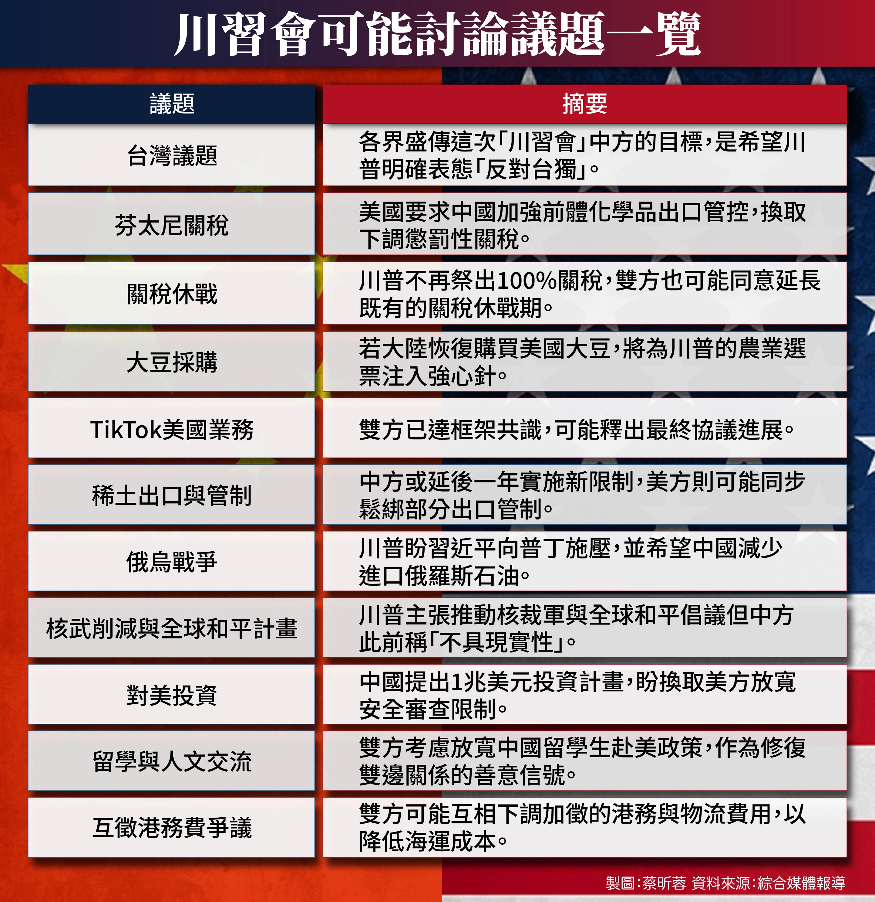 雖然外界關注台灣是否將成為議題要點之一,但川普此前僅稱「台灣就是台灣」,顯示美方可能不會主動提及,也不預期此為會談焦點,美國國務卿盧比奧(Marco Rubio)也強調,不會以放棄對台支持為代價換取貿易協議,他近日與大陸外交部長王毅通話後,雙方的官方通稿也均未提及台灣,相關議題可能將低調帶過。