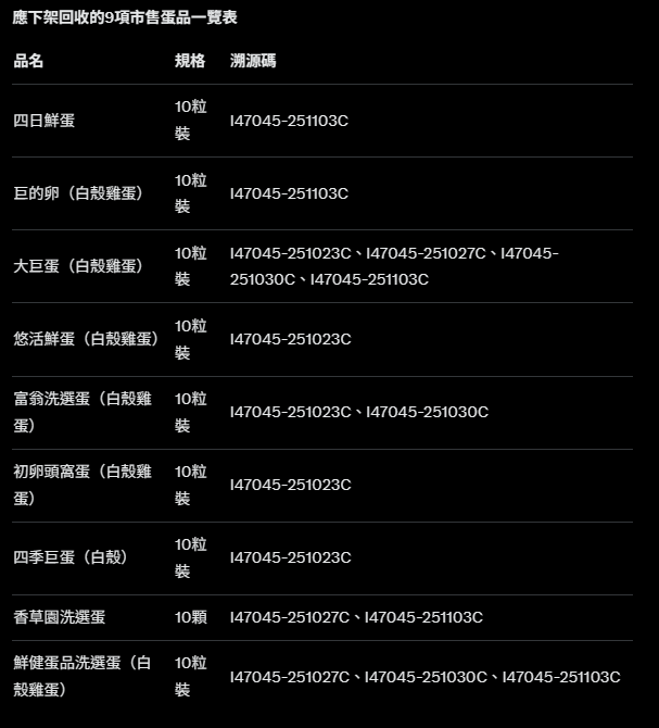 食藥署呼籲,消費者如已購買下列蛋品,請立即停止食用,可至原購買通路辦理全額退貨。高雄市賣場若未主動通知消費者,將依法處罰。