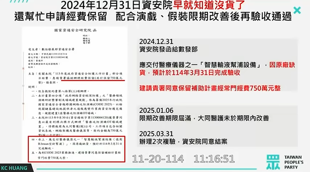 「數發部同仁從頭到尾都知道!」黃國昌強調,數發部同仁從頭到尾都知道不可能在1月6日前完成改正,這時侯,宜秀露出困惑表情;黃國昌又說,他會這麼斬釘鐵齒的說是因為,資安院發函要求大同醫護要在2025年1月6日前完成改正的同一天,資安院也發函給數發部辦理經費保留750元(應交付醫療儀器之一的智慧輸液幫浦設備,因原廠缺貨,預計今年3月31日完成驗收)。