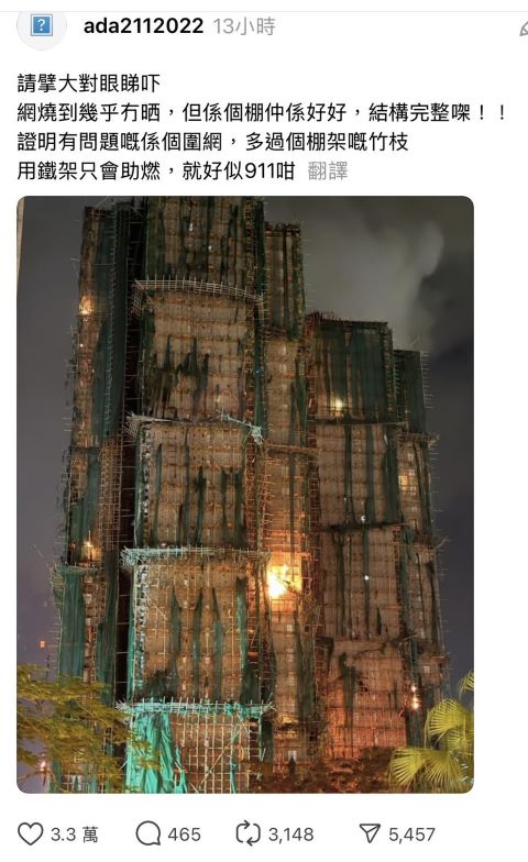 不少香港居民從現場照片發現,防火性能差的防塵網幾乎燒成灰,大部分竹棚主結構反而仍屹立不倒。甚至有人指出,若改用金屬架,在高溫下反而可能加速導熱,「竹棚不是元兇,不阻燃的圍網才是問題」。