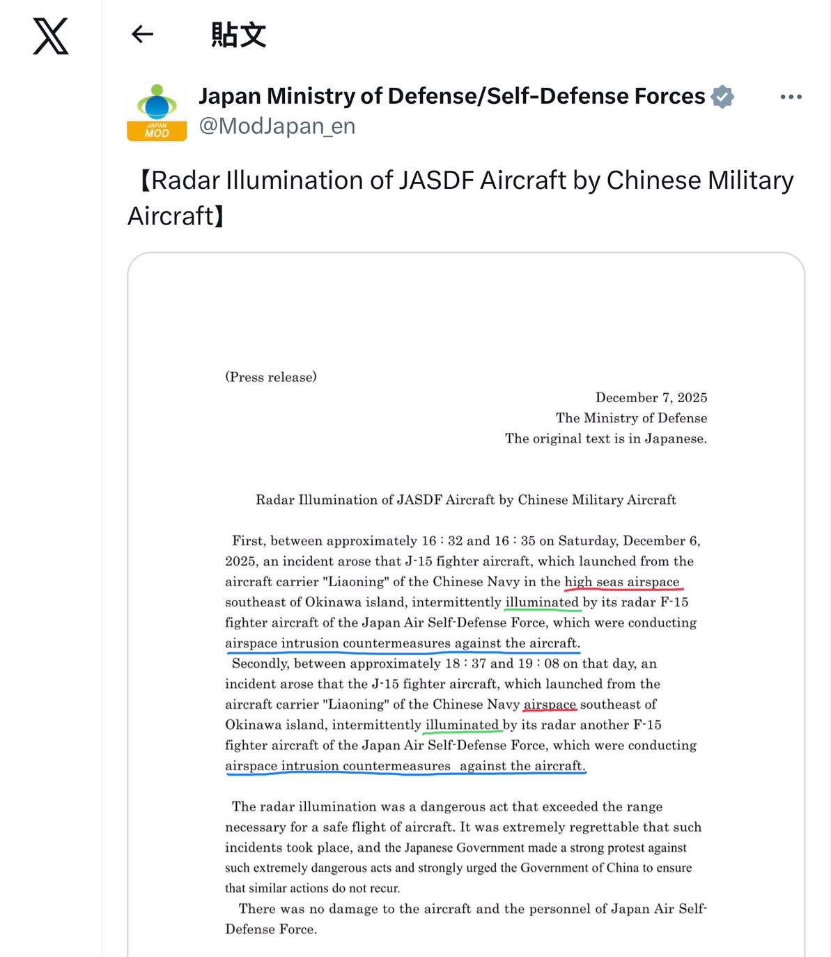 若是對比英文版本,就會發現僅提到「airspace intrusion」但卻完全不提侵入何種空域,從日文版本與英文版本差異來說,就可證明日本防衛省在發佈不同版本公告新聞稿時是多麼狡猾。