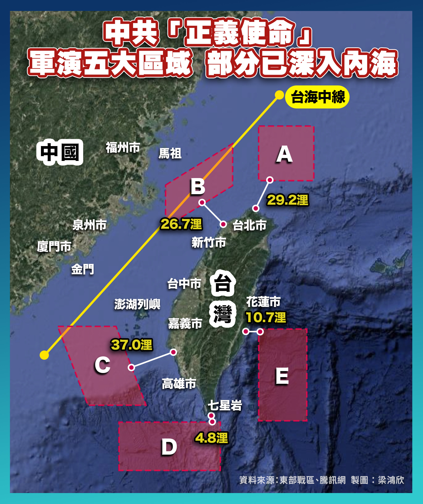根據東部戰區公布資訊,本次演習涵蓋多方向,其中南部操演區距離台灣本島最近處約4.8浬(約8.8公里),東部部分區域亦僅10.7浬(約18公里)。大陸時政評論人占豪分析,這樣的距離對現代空軍與飛彈武器而言,已不再是「逼近」,而是實質進入可即時打擊、即時反應的作戰半徑。