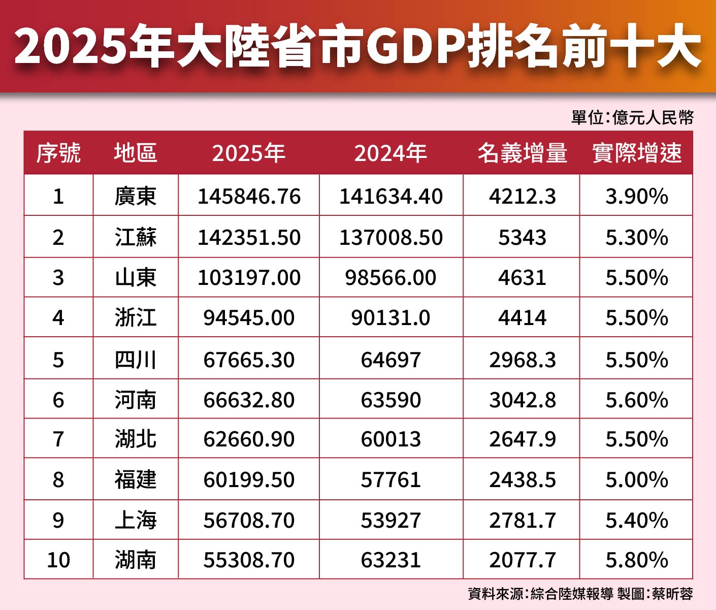 大陸31個省(市、自治區)2025年經濟成績單全部爐,呈現一幅「頭部穩固、中西部突圍、尾部分化」新版圖。廣東以14.58兆元(人民幣,下同,合約台幣66兆元)GDP連37年稱霸全國,江蘇首破14兆元、山東衝破10兆元,三省攜手闖入「10兆俱樂部」,十強門檻飆升至5.5兆元。