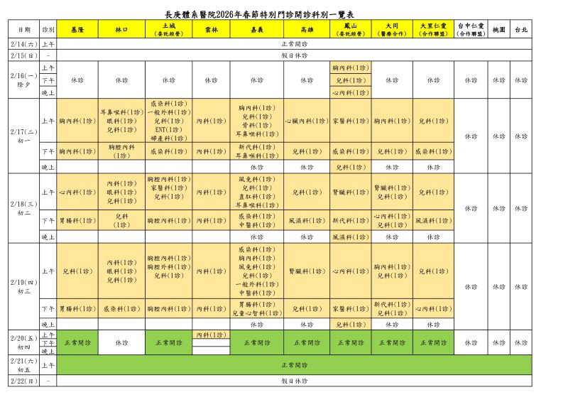 長庚醫院表示,春節期間各院區門診及急診服務資訊已公告,民眾可透過長庚醫院官網或「長庚e指通」App查詢。各院區門診服務預計自220日(大年初四)起陸續恢復。