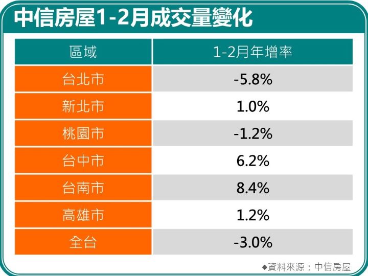 中信房屋統計內部成交件數,今年1-2月全台交易量相較於去年同期減少約3%,進一步觀察六都的成交量數據變化,台北市年減5.8%,新北市年增1%,桃園市年减1.2%,台中市年增6.2%,台南市年增8.4%,高雄市年增1.2%。