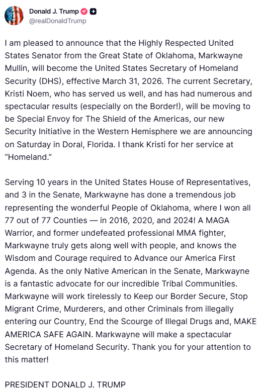川普在他的社群平台Truth Social發文表示:「我很高興宣布,來自偉大奧克拉荷馬州、備受尊敬的美國聯邦參議員穆林,將於2026年3月31日起出任美國國土安全部長。」