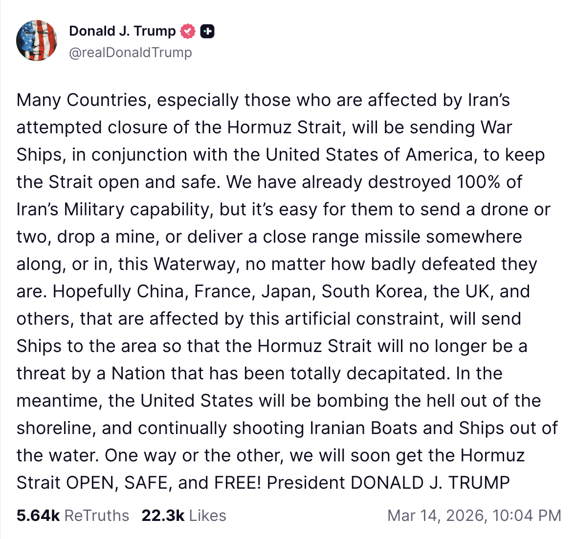 川普在他的社群平台Truth Social發文指出,「許多國家,特別是那些受到伊朗試圖關閉荷姆茲海峽影響的國家,將與美利堅合眾國一起派出軍艦,以確保這條海峽保持開放與安全。」他說,美國也將與相關國家協調,「讓一切迅速、順利且妥善進行」。