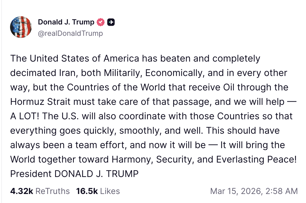 在美國與以色列對伊朗發動攻擊兩周後,德黑蘭封鎖荷姆茲海峽(Strait of Hormuz),導致油價飆升。美國總統川普(Donald Trump)14日呼籲中國、英國、法國、日本與韓國派遣軍艦,協助確保這條承載全球約20%石油與天然氣運輸的關鍵航道安全。與此同時,伊朗攻擊擊中巴格達的美國大使館及阿拉伯聯合大公國一處大型能源設施,進一步震動能源市場。