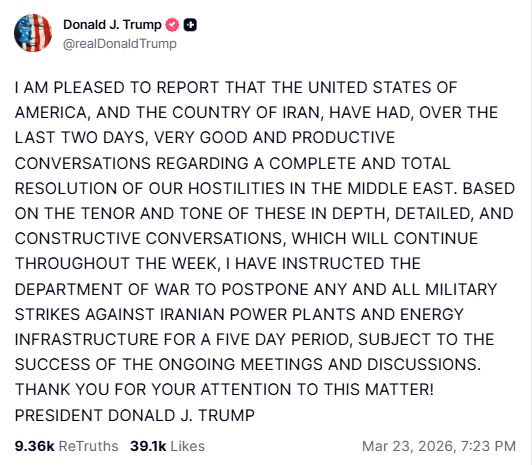 路透報導,川普在他的社群媒體Truth Social發文稱,美國與伊朗已就「全面且徹底結束中東敵對行動」進行「非常良好且具成果」的對話。他表示,已指示戰爭部,暫停對伊朗發電設施與能源基礎設施的打擊,為期五天。此舉帶動股市上漲,油價則大幅回落至每桶100美元以下,扭轉他21日威脅與伊朗報復言論引發的市場動盪。
