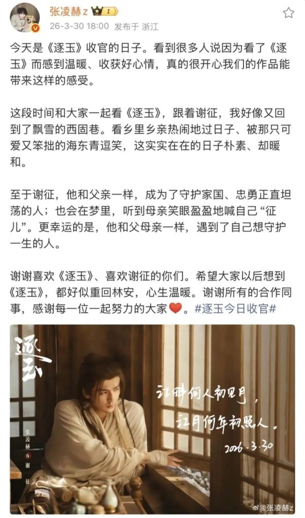大陸古裝劇《逐玉》於3月30日正式收官,由張凌赫、田曦薇主演的劇集播出期間創下多項平台紀錄,並在兩岸及海外市場引發高度關注。張凌赫當晚透過社群發文,告別角色「謝征」,以「江畔何人初見月」作結,延續其自《蒼蘭訣》以來的收官書寫傳統,被外界視為極具儀式感的演員表達方式。