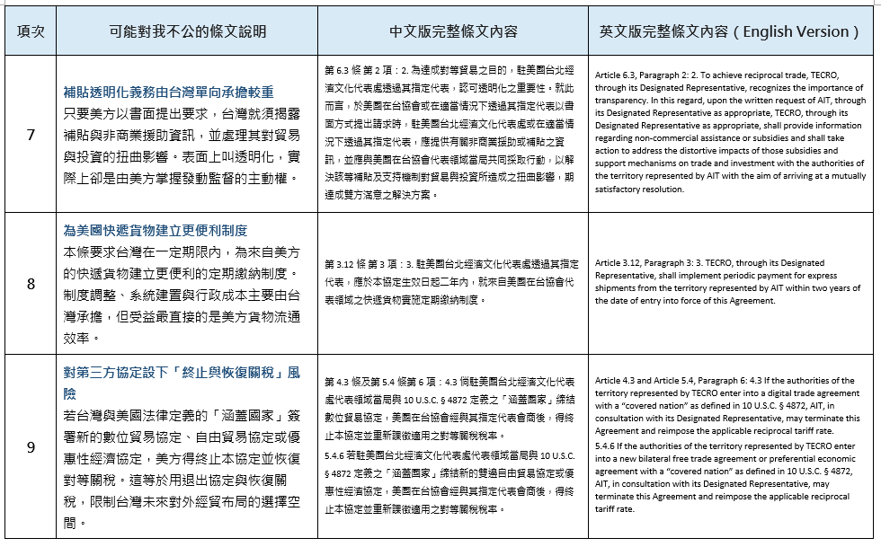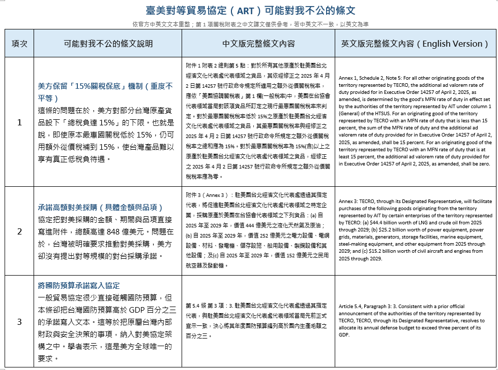除了法律主權,台美對等貿易協定 (ART) 在財務與行政上也賦予了台灣沈重的義務。