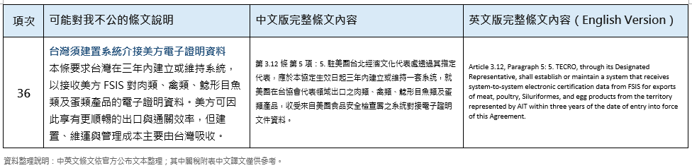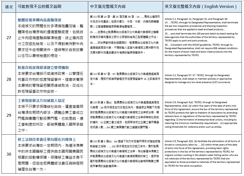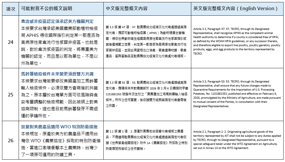 而媒體也發現3月底美國貿易代表署(USTR)發布的2026年《貿易障礙報告(NTE)》指出了ART中許多未曾被大眾仔細討論的承諾,包括全面開放美牛、美豬及相關副產品,包括終止對美國牛肉逐箱查驗與解凍檢查、終止對美國豬肉百分之百逐批檢測,以及不得對美洲野牛肉要求狂牛症相關條件,甚至放棄農產品特別防衛措施(SSG)。
