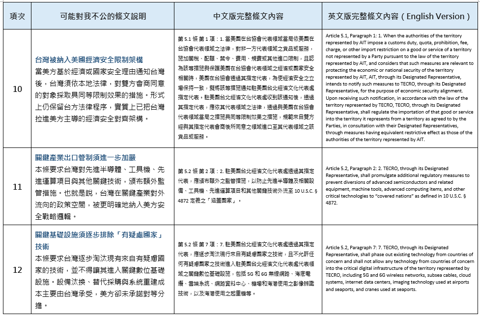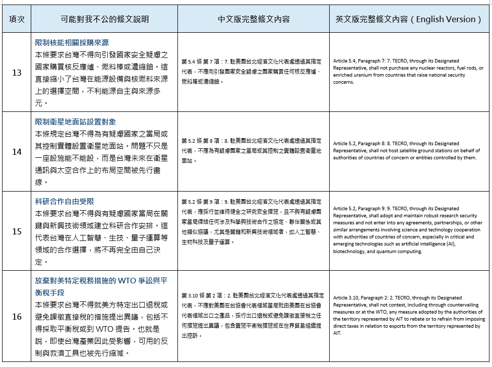 「毒丸條款」的制約:若台灣與美國認定的國家(依美國的法律認定)簽署任何新的 FTA 或數位貿易協定,美國有權單方面終止本協定。