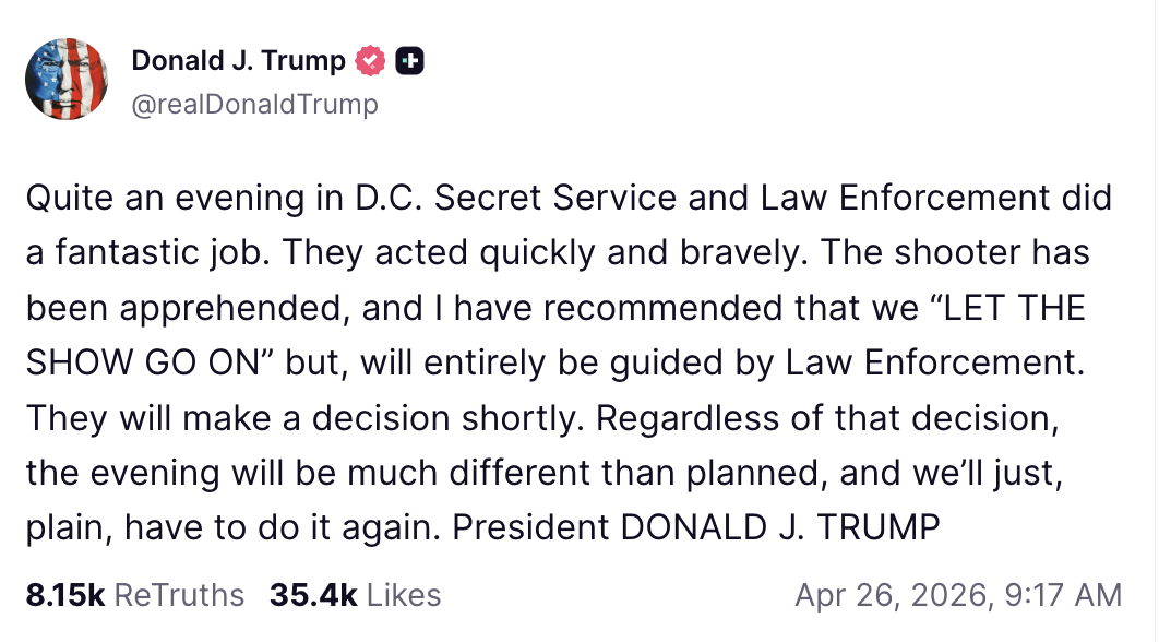 所有聯邦官員,包括川普本人,均確認安全。川普在被撤離約一小時後於他的群平台Truth Social發文表示:「槍手已被逮捕」。川普寫道:「華盛頓今晚相當不平靜。特勤局與執法部門表現非常出色。」隨後他再度發文指出:「第一夫人、副總統,以及所有內閣成員狀況完全良好。」並表示將於當晚在白宮召開記者會。