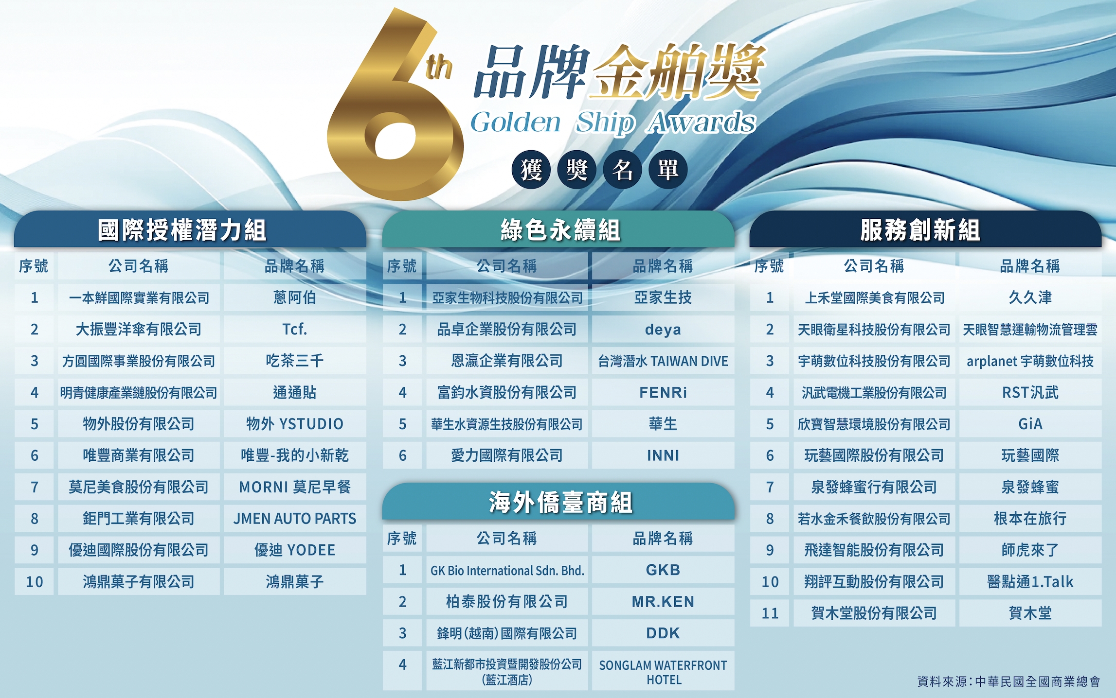 由中華民國全國商業總會主辦的「第六屆品牌金舶獎」於今(22日)舉行頒獎典禮,由產官學組成的評審團選31家海內外傑出企業品牌。商總理事長許舒博表示,舉辦品牌金舶獎的意義除了提升廠商的品牌價值外,更重要的是行銷國際。商總也成立「金舶獎聯誼會」,讓歷屆得獎廠商互相幫忙、合作。另外,今年商總帶著拓銷團赴日本、韓國,短短2天的活動,就賣出5.6億的訂單。