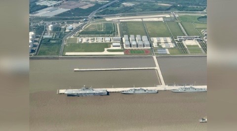 當民航客機飛過上海黃浦江外灘地區的解放軍海軍碼頭附近時,可以發現去年才由習近平命名下水的075型「安徽艦」兩棲攻擊艦就停泊在岸邊,嶄新的艦體很難不讓人注意到,另外也停泊了兩艘054A型全新護衞艦艦隊看起來十分醒目。