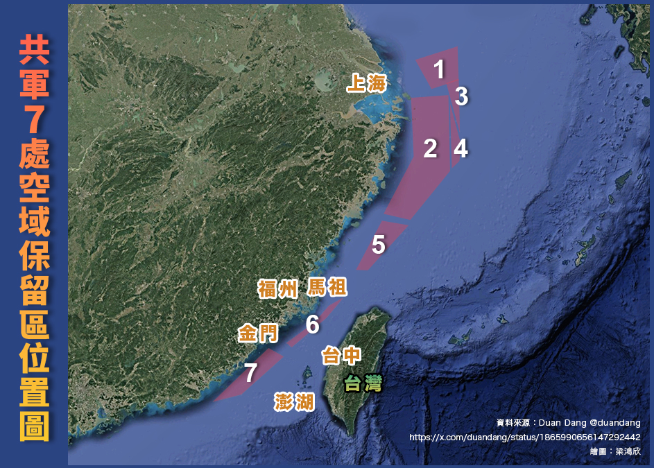 謝日昇提到,解放軍劃設的空域保留區刻意避開國際航路、範圍在台海中線以西,從上海東面一路往南到福建,總長約1000公里,從範圍可知,對岸欲震懾的對象已不僅是我方,受威脅不只有台灣;解放軍艦船活動範圍延伸至西太平洋以東,不只是想全面包圍台灣,而是想將兵力向外發散,企圖拒止外軍介入,意圖非常明顯。