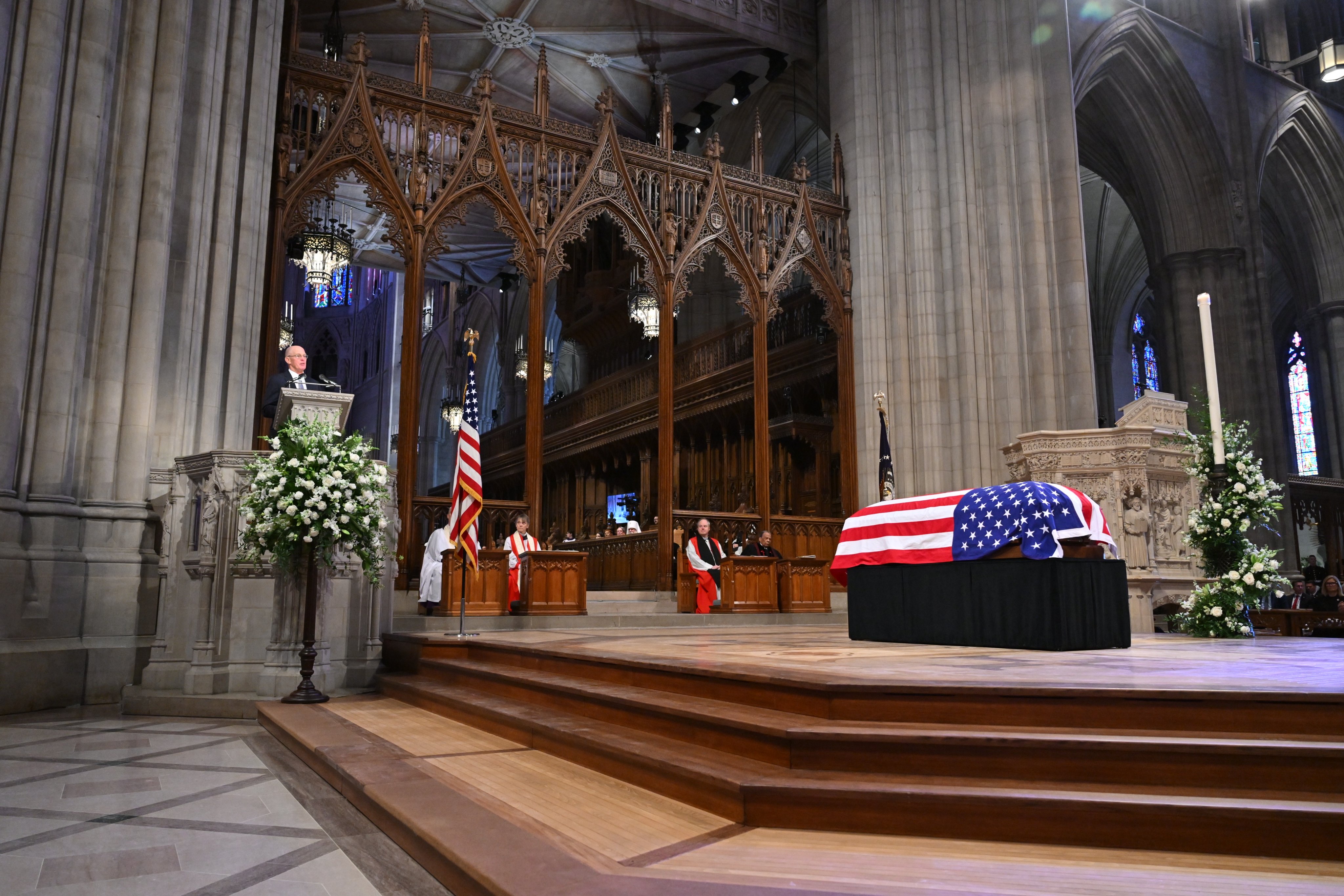 儀式開始前,川普與其前副總統彭斯(Mike Pence)握手。這是二人自2020年大選後決裂以來罕見的互動。但彭斯的妻子卡倫(Karen Pence)未起身迎接川普。而前第一夫人蜜雪兒·歐巴馬(Michelle Obama)則未參加葬禮。