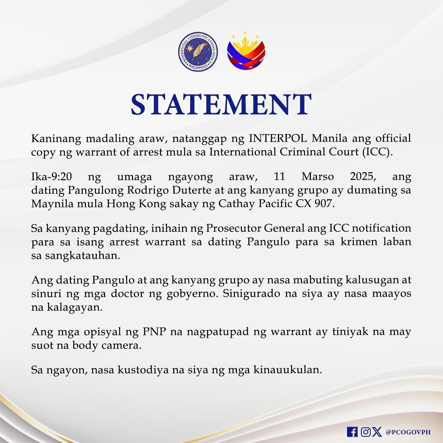 而杜特蒂周二上午按原定行程從香港返抵馬尼拉,在機場隨即遭到馬尼拉國際刑警組織(Interpol)逮捕,目前已遭到拘留。菲律賓總統府馬拉坎南宮同時也發聲明,表示馬尼拉國際刑警組織當天一早收到ICC發出逮捕令的正式副本,警方隨即至機場將他逮捕。