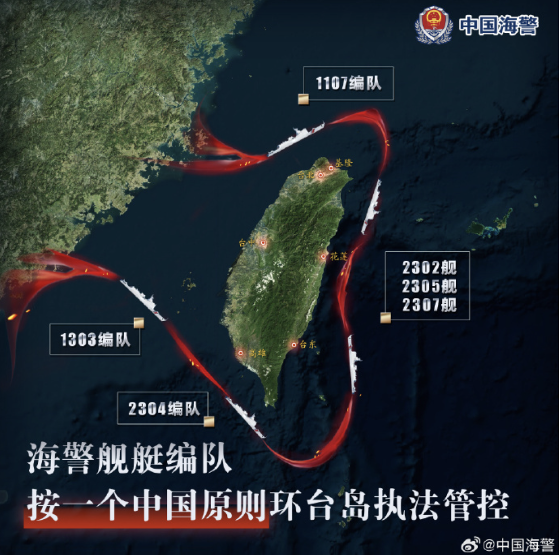 大陸海警艦艇編隊1日環台組織執法巡查。圖/取自中國海警微博