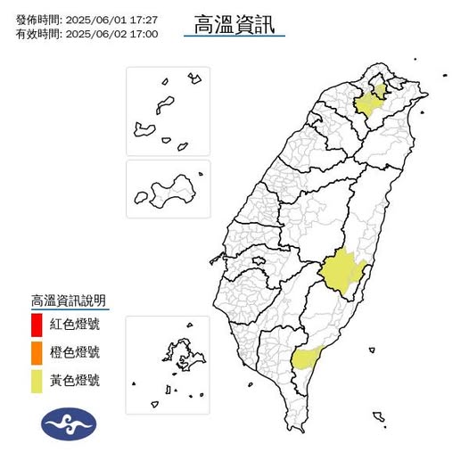 氣溫方面,南部高溫約攝氏32、33度,其他地區高溫約33至35度,並且受到西南風沉降影響,台東易有焚風發生。氣象署發布高溫資訊,大台北盆地、花東縱谷及台東局部為「黃色燈號」,高溫可以達到36度以上,而低溫則普遍在25至28度。離島天氣方面,澎湖為多雲時陰、26至33度,金門多雲短暫陣雨或雷雨、26至32度,馬祖多雲短暫陣雨或雷雨、24至29度。