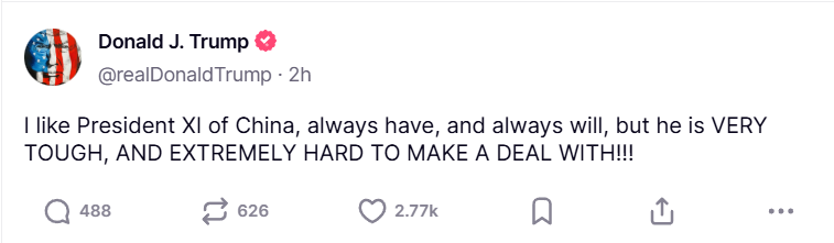 綜合路透、彭博社(Bloomberg)報導,川普於華府時間4日凌晨2時17分許在他的社群平台Truth Social發文寫道:「我喜歡中國國家主席習近平,一直都喜歡,也將一直如此,但他非常強硬,而且極難跟他談成協議!!!」