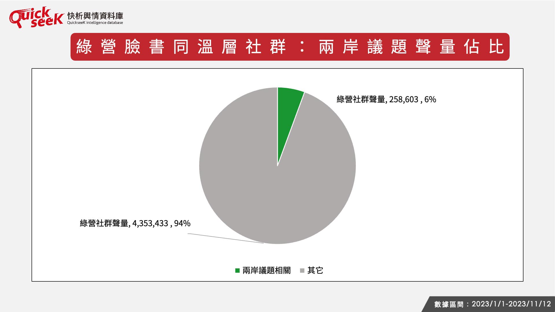 黎榮章從另一角度觀察,民進黨同溫層社群中有關兩岸議題的貼文佔比,只占全部貼文的6%,可見,除了賴清德本人的幾次談話外,民進黨並未系統性地投入操作,或意圖用兩岸議題來激化選情。
