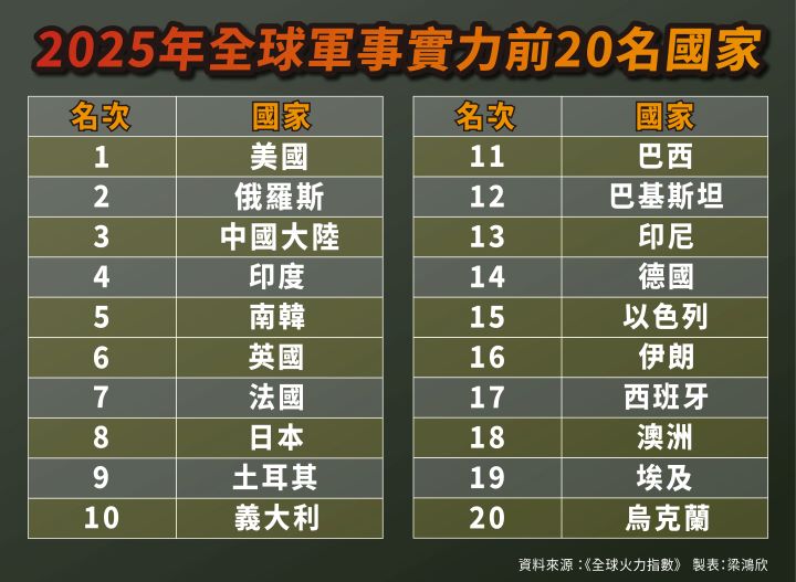 全球軍力版圖再度洗牌,《全球火力指數》(Global Firepower)發布 2025 年最新「全球軍事力量排名」,美國、俄羅斯與中國大羅連續蟬聯前三,美國依舊以壓倒性軍事資源坐穩全球第一。南韓、日本維持前十,台灣則以軍力指數(PwrIndx)0.3988、位居第 22名,憑藉近年本土造艦與航太研發的快速成長,在亞洲國家中表現亮眼。