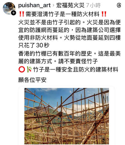不少香港居民從現場照片發現,防火性能差的防塵網幾乎燒成灰,大部分竹棚主結構反而仍屹立不倒。甚至有人指出,若改用金屬架,在高溫下反而可能加速導熱,「竹棚不是元兇,不阻燃的圍網才是問題」。