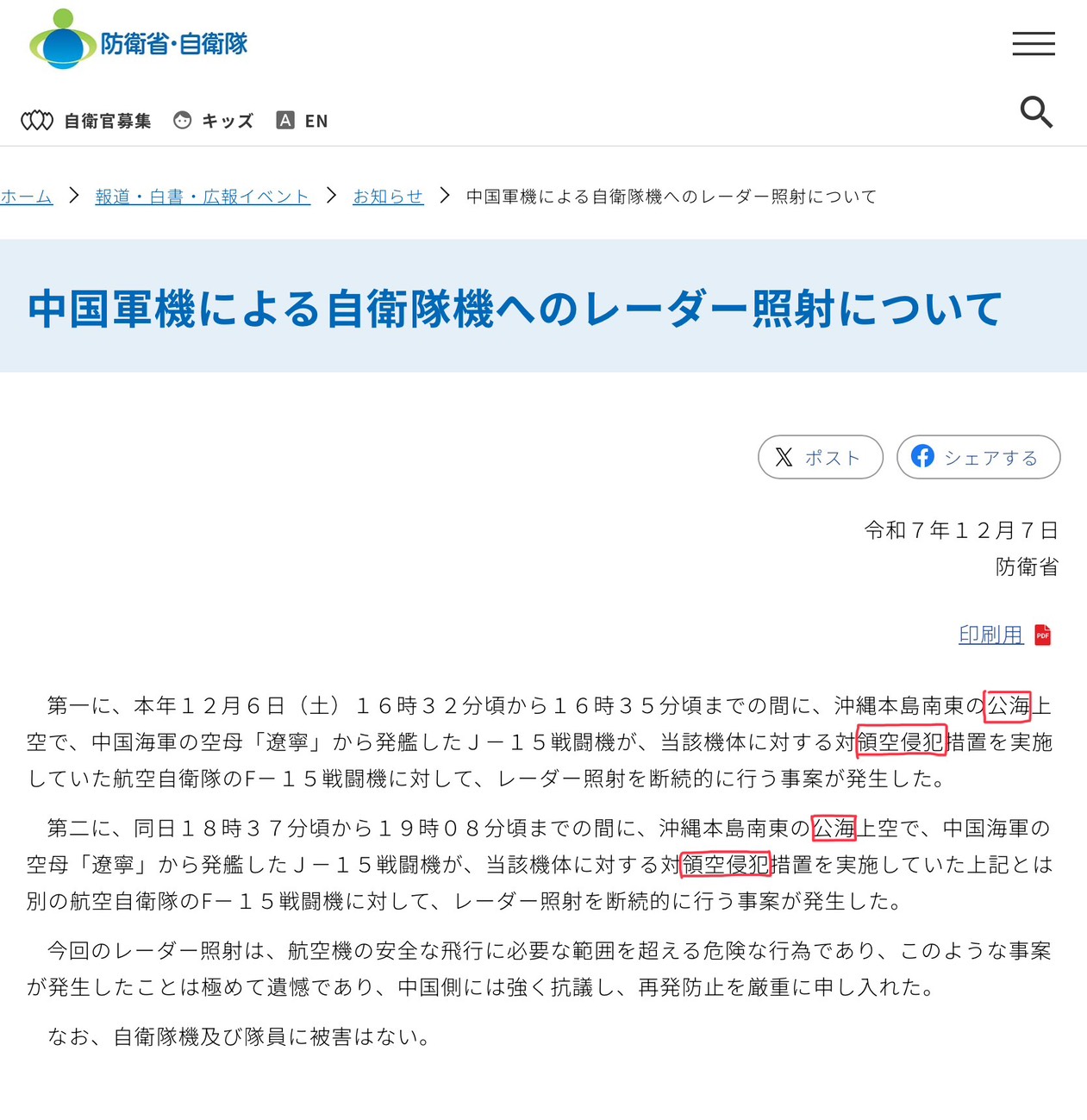 若是對比英文版本,就會發現僅提到「airspace intrusion」但卻完全不提侵入何種空域,從日文版本與英文版本差異來說,就可證明日本防衛省在發佈不同版本公告新聞稿時是多麼狡猾。