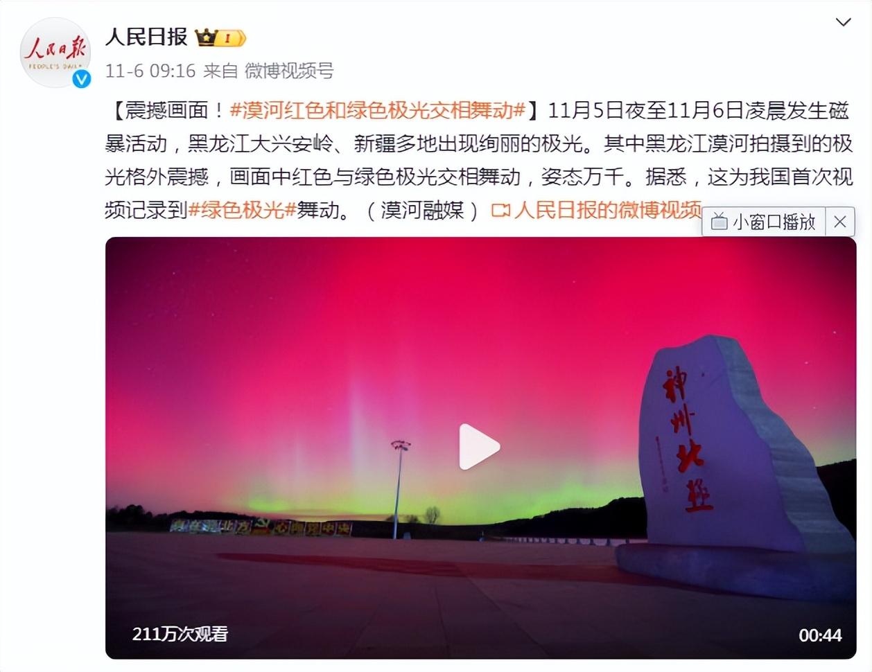 大陸《人民日報》上個月也發出了極光的美照,吸引不少人注意。圖/引自今日頭條