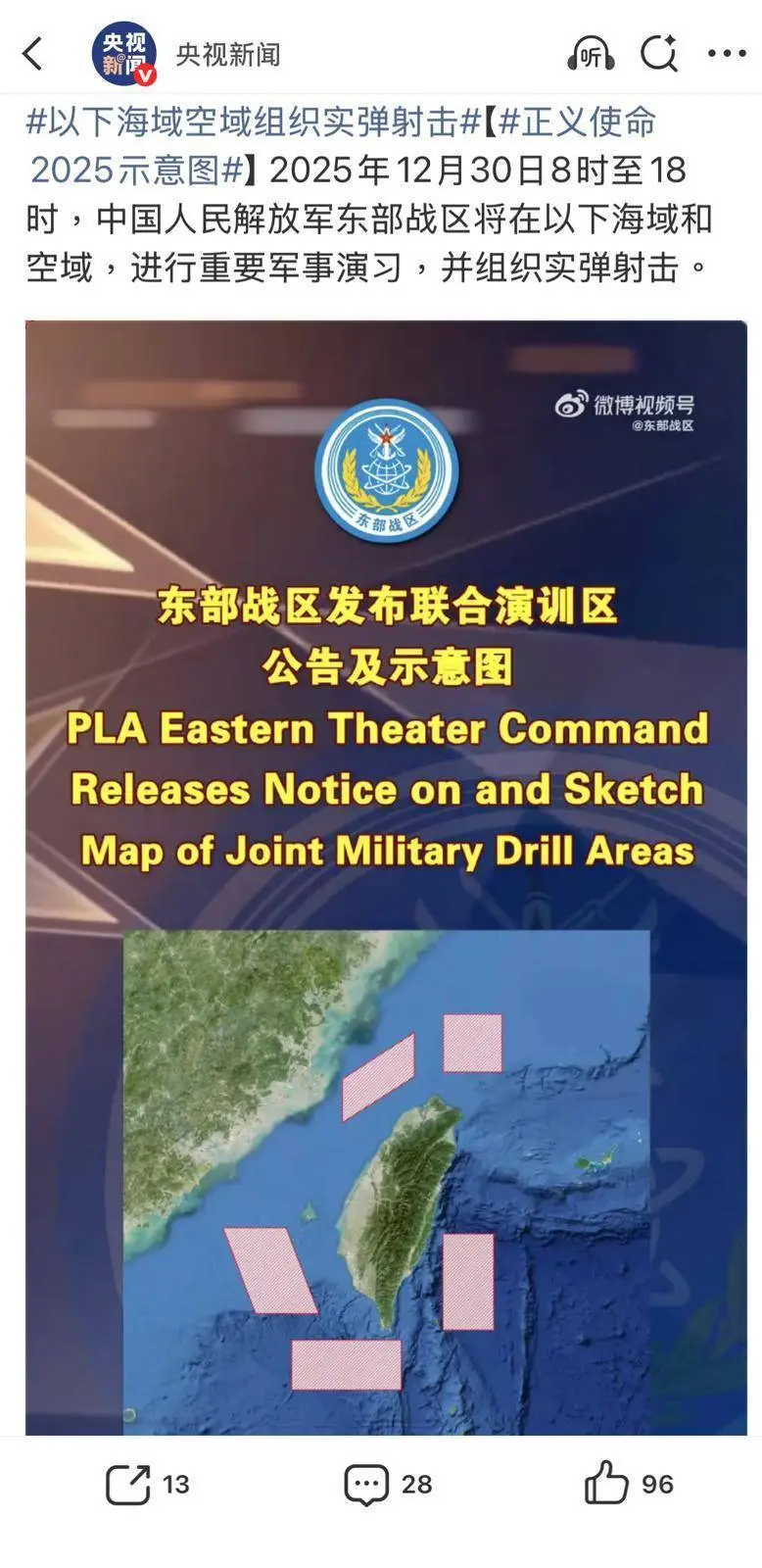 解放軍東部戰區29日上午宣布,組織陸軍、海軍、空軍、火箭軍等兵力,位台灣海峽、台島北部、台島西南、台島東南、台島以東,組織「正義使命-2025」演習,實彈射擊時間為30日上午8時至下午6時止。重點演練海空戰備警巡、奪取綜合制權、要港要域封控、外線立體懾阻等科目,艦機多向抵近台島,諸軍兵種聯合突擊,旨在檢驗戰區部隊聯合作戰實戰能力。