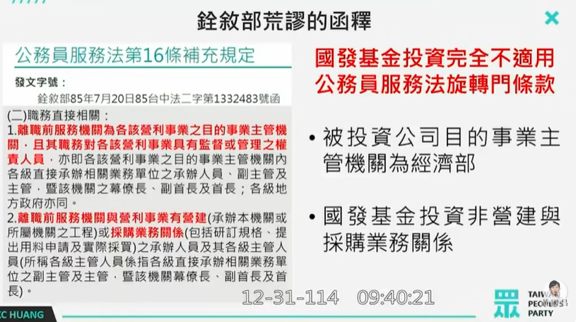 黃國昌說,當他明確點出違法時,「國發基金很會」,趕快幫忙找擋箭牌,《公務員服務法》法條文義如此明確,不要用什麼目的解釋、體系解釋、歷史解釋,「結果國發基金膽子好大,趕快幫忙脫罪」,方法是拿銓敘部30年前的函釋當擋箭牌,認定國發基金投資完全不適用旋轉門條款。