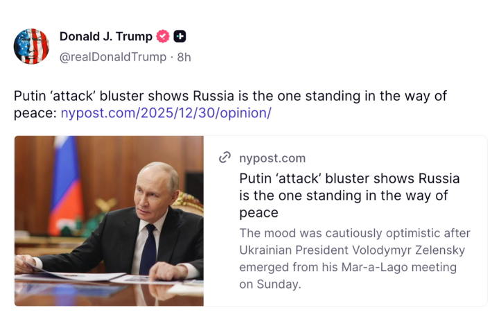 彭博社報導,川普周三(12月31日)在社群媒體上轉貼這篇社論,標題為《普丁拿『遇襲』叫囂,揭露俄羅斯才是和平絆腳石》(Putin ‘attack’ bluster shows Russia is the one standing in the way of peace),但未附加任何個人評論。