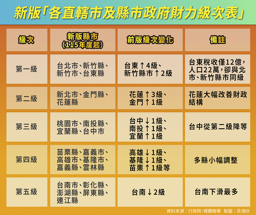新版財政分配法(財劃法)今年正式上路,中央大幅提升地方財源,行政院主計總處隨即公布適用115年度(2026年)的全新「直轄市及縣市政府財力級次表」。這份分級以地方政府自有財源比率為基準,將全台22縣市劃分為第一至第五級,其中級數越低代表財力越強,未來申請中央計畫型補助時,自籌款比率將越高,意味地方須負擔更多財政壓力。