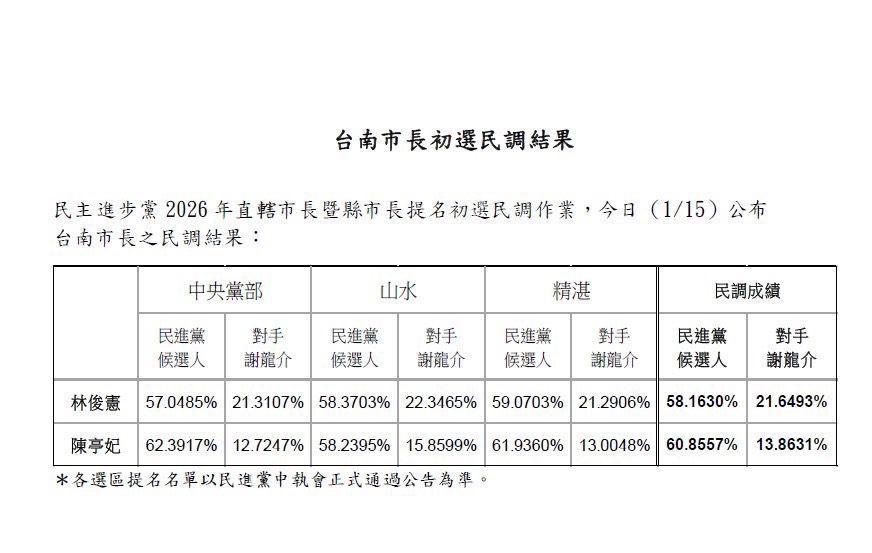 【快訊】民進黨台南市長初選出爐 陳亭妃擊敗林俊憲 發佈時間:2026/01/15 11:40 政治 小 中 大 民進黨台南市長初選民調結果15日上午出爐,由陳亭妃(圖)獲勝。圖/中央社 梅花新聞網 林瑞益/綜合報導 民進黨台南市長初選民調結果今(15)日上午出爐,原被外界看好領先的立委林俊憲未能勝出,由立委陳亭妃逆勢翻盤、取得最高支持度。民調顯示,陳亭妃贏2%,將代表民進黨參選2026台南市長選舉。 更新時間:2026/01/20 16:10 內文字數:76 台南市長 民進黨 林俊憲 初選 陳亭妃 賴清德 延伸閱讀 民進黨台南長初選今晚登場 妃、憲絕招盡展 賴瑞隆初選燒上億?她曝「地下市長」伸黑手:新潮流推出來的吉祥物 貫徹「德意志」?賴瑞隆靠黨中央民調翻盤 邱議瑩:不需各式陰謀論 熱門文章
