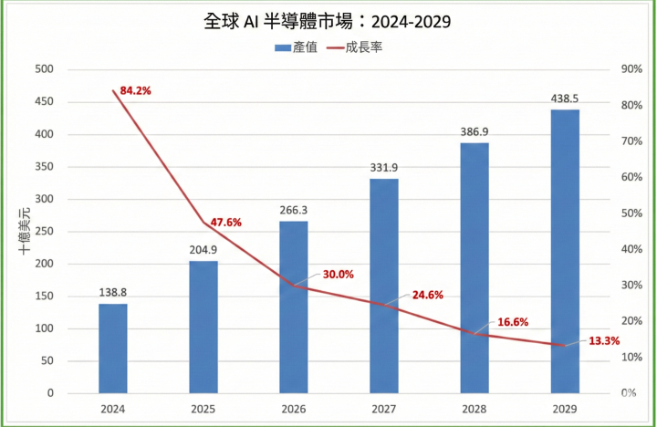 隨著AI應用由雲端資料中心向邊緣運算環境擴散,市場正進入「高速且可持續」的擴張期。預計2025年市場規模將衝刺至2,049億美元(年增率 47.6%);放眼中長期,2029年整體市場可望達到4,385億美元,維持25.9% 的強勁年複合成長率。