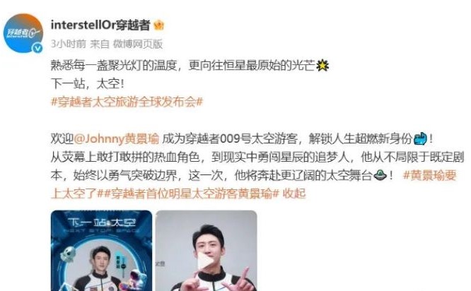 大陸商業航天再迎話題性突破。1月22日,演員黃景瑜官宣成為「009號太空遊客」,將搭乘中國大陸首艘商業太空船「穿越者壹號」(CYZ1)執行次軌道飛行任務。消息公佈後,「預售票一張300萬元(人民幣,下同)(約合1350萬新台幣)」等話題迅速登上微博熱搜。