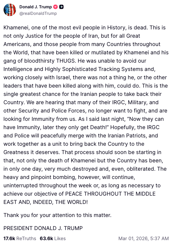 川普在社群平台發文宣布哈米尼死訊,稱這位阿亞圖拉是「歷史上最邪惡的人之一」,但未提供更多細節。他指出,哈米尼之死「不僅還給伊朗人民正義,也還給所有偉大的美國人,以及全世界許多遭哈米尼及其嗜血暴徒集團殺害或殘害的人民一個公道。」並補充:「他無法躲避我們的情報與高度精密的追蹤系統。在與以色列密切合作下,他以及與他一同被擊斃的其他領導人,根本無計可施。」